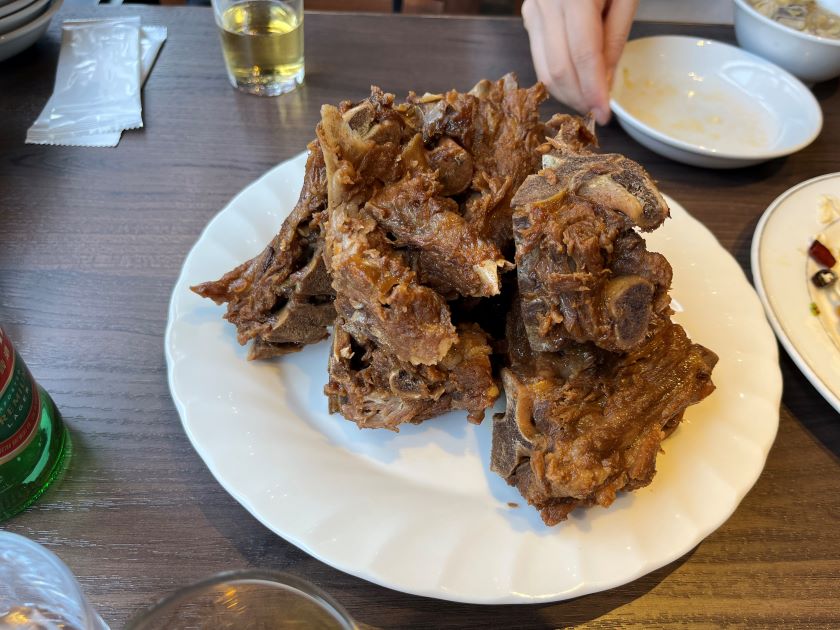 ―八角の香りの強い醤油で似た骨にくっついている肉を、ビニール手袋をした手で持って肉をこそぎ取りながら食べる